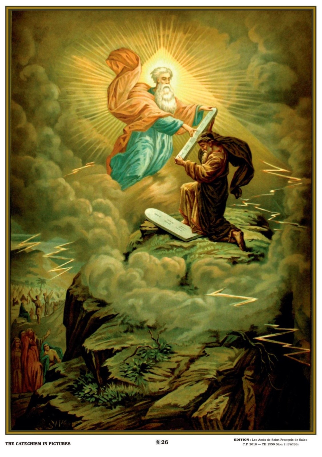 11.图上画的是梅瑟从天主手中领受两块十诫碑。在此期间,密布的乌云一直笼罩着西乃山,山下的人们目睹电闪,耳闻雷鸣和号角声。天主将这些迹象显示人,为让祂的子民充满敬畏,好使他们更容易遵守祂的律法。