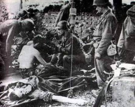 伤残遍地的道路 1917年 一战中英军主要的供应线中最危险的一条是莫宁路。很自然地,这也是伤亡最多的地点之一。勇敢的澳大利亚士兵在两次世界大战中都竭力为其宗主国英国而战,经常被安排在战斗最艰苦的前线,尤其是这一次完全是“无缘无故”地参战,因为战争并未波及其国土。照片所示的是澳大利亚伤兵从莫宁路前线步行返回,路边已躺满那些无法走动的伤兵—缺医少药将使他们蒙受极大的痛苦,许多人将终生残疾。 战地包扎所
