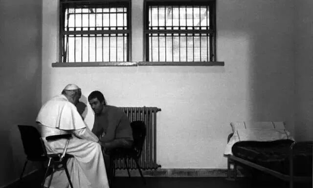 教宗若望·保禄二世在监狱与刺客阿加交谈。阿加对罪行感到后悔。
